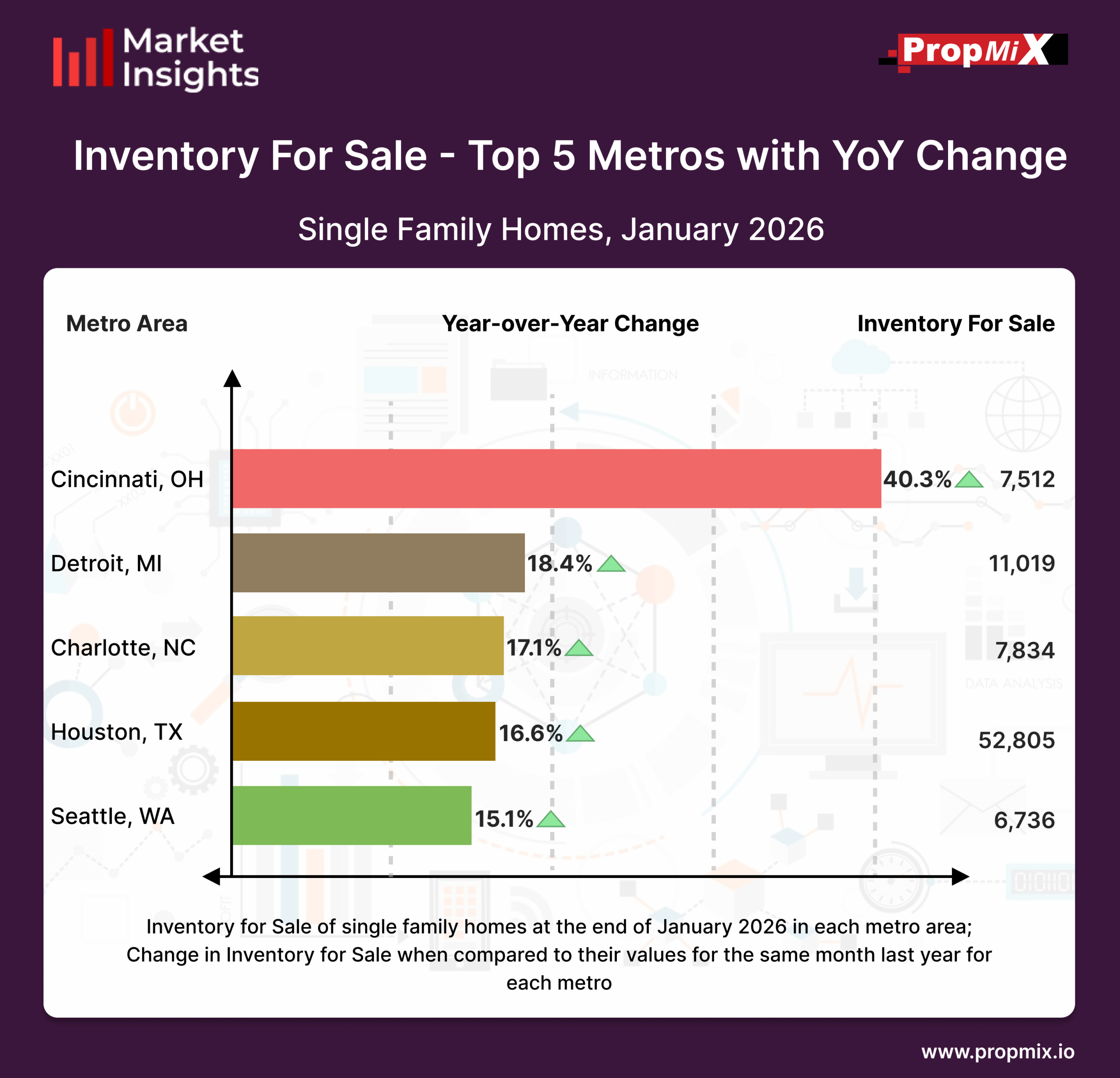 Inventory levels increased across several major U.S. housing markets in January 2026, reflecting continued growth in active listings to start the year. The Cincinnati metro area led this group with a 40.3% year-over-year increase, bringing total inventory to approximately 7,512 homes for sale.The Detroit metro area followed with an 18.4% annual rise, reaching about 11,019 active listings. Charlotte recorded a 17.1% increase, ending the month with roughly 7,834 homes on the market.Houston continued to show elevated supply levels, posting a 16.6% year-over-year gain and reaching approximately 52,805 active listings. Meanwhile, Seattle reported a 15.1% increase, with inventory climbing to around 6,736 homes.Overall, January data indicates sustained inventory expansion across these key markets compared to the same period last year.