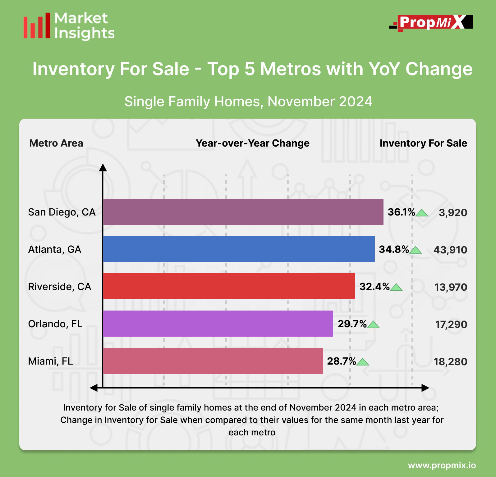 The San Diego metro area recorded the highest year-over-year growth in inventory for sale among the top 30 U.S. metro areas in November 2024, with a 36.1% increase and 3,920 units available. The Atlanta metro area followed closely, with a 34.8% rise and 43,910 units, while the Riverside metro area saw a 32.4% increase, reaching 13,970 units. The Orlando metro area experienced a 29.7% growth with 17,290 units, and the Miami metro area reported a 28.7% rise, totaling 18,280 units available.