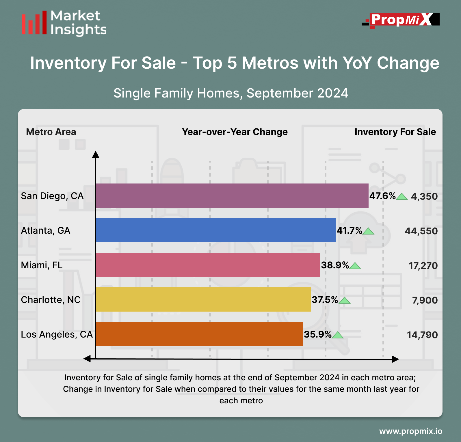 In September 2024, among the top 30 U.S. metro areas, those with significant year-over-year percentage increases in inventory for sale included the San Diego metro area, which saw the largest rise at 47.6%, followed by the Atlanta metro area with a 41.7% increase. The Miami metro area experienced a 38.9% gain, while the Charlotte metro area posted a 37.5% increase. Rounding out the top five, the Los Angeles metro area saw a 35.9% rise.