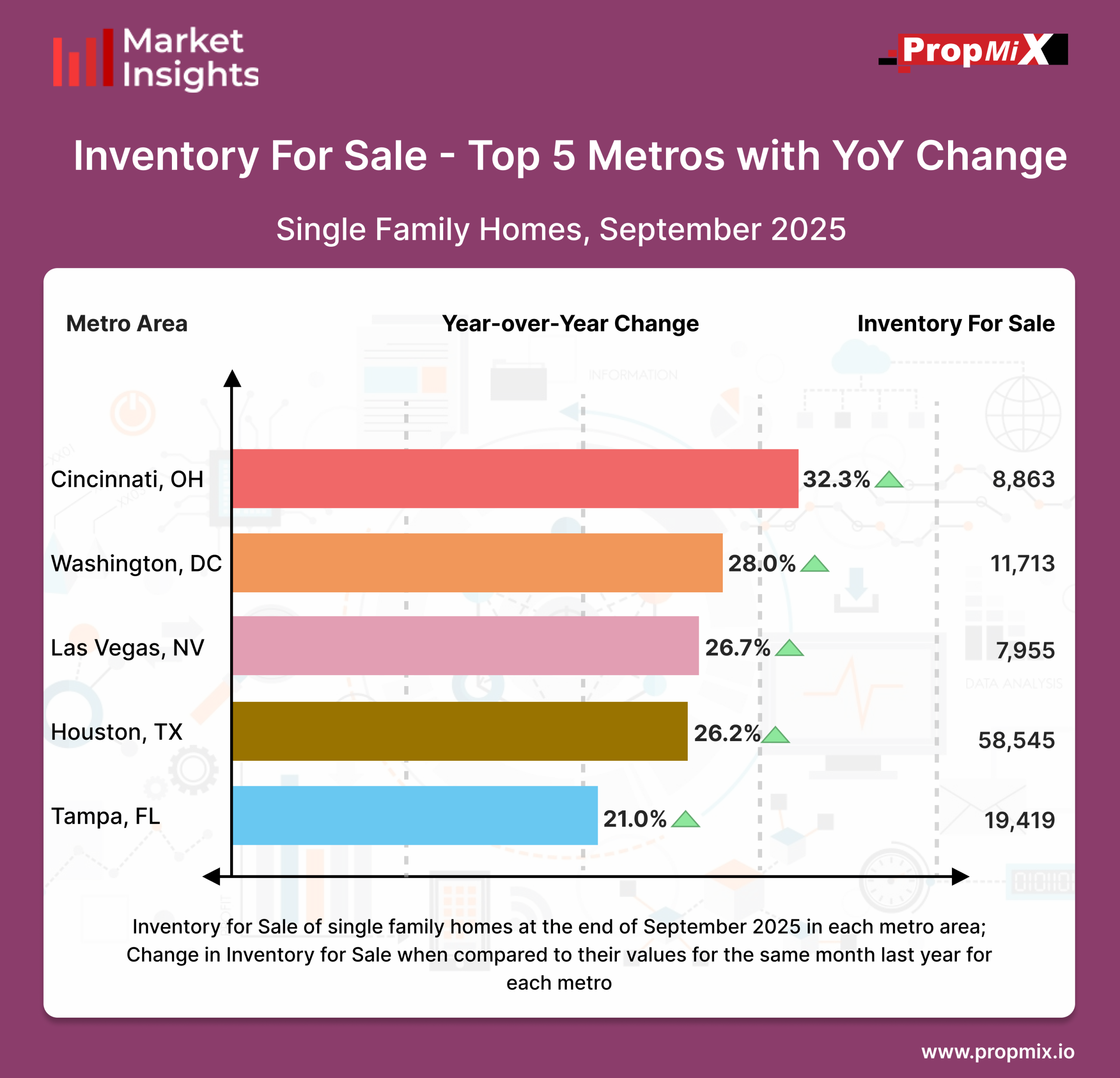 Houston also showed significant growth, reporting a 26.2% increase and offering roughly 58,545 homes, and Tampa rounded out the top five metros with a 21.0% jump, reaching about 19,419 listings.