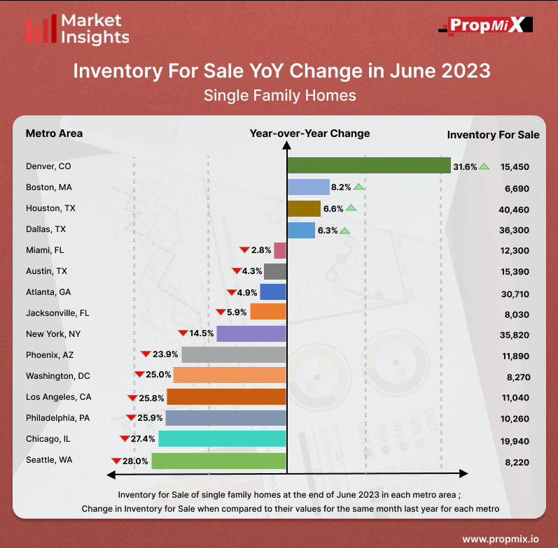 Denver saw the highest rise in homes available for sale in June 2023 among the top 15 metro areas, the number of homes for sale rose by 31.6% compared to June 2022, with a total of 15,450 listings. Meanwhile, Seattle experienced a considerable drop in single-family home inventory, decreasing by 28% in June 2023 compared to the previous year.