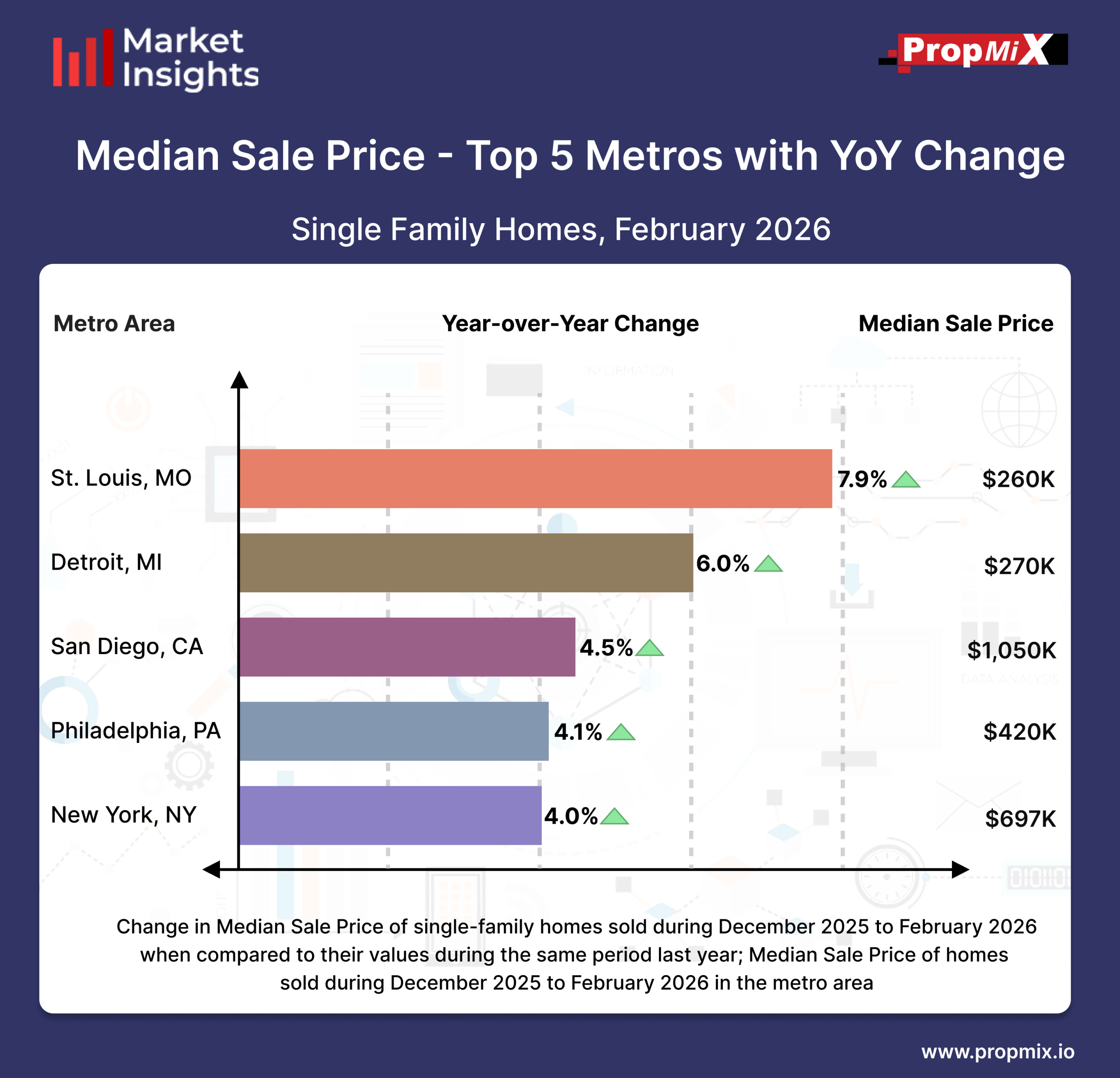 As 2026 progressed, year-over-year changes in median sale prices across major U.S. metro areas continued to reflect steady but varied growth, with several markets posting moderate annual gains in February 2026.St. Louis, MO led the top metros with a 7.9% year-over-year increase, bringing the median sale price to $260K. Detroit, MI followed with a 6.0% annual rise, with median home prices reaching $270K, indicating continued affordability-driven demand in Midwest markets.San Diego, CA recorded a 4.5% increase, with median prices at $1,050K, maintaining its position among the higher-priced coastal markets. Philadelphia, PA saw a 4.1% year-over-year gain, with median sale prices at $420K. New York, NY rounded out the top five with a 4.0% annual increase, holding a median sale price of $697K, reflecting stable price growth in a major metropolitan housing market.
