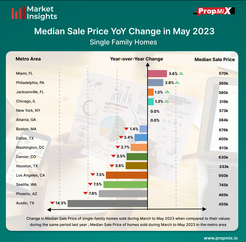 On the other hand, Austin metro area experienced a downturn in the year-over-year change in median sale price during the same March to May 2023 period. Among the top 15 metros, it witnessed a significant decrease of 14.3% compared to the corresponding period from the previous year, resulting in a median sale price of $455,000. This decline marked a noteworthy setback for the real estate market in Austin, highlighting challenges faced by the city during that specific timeframe.
