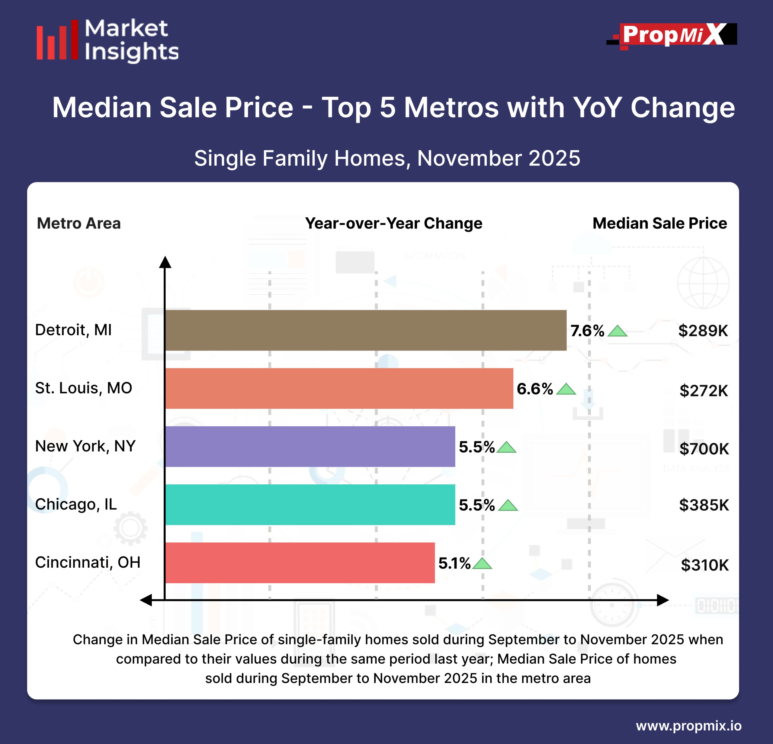 As 2025 moved deeper into the final quarter, home price trends across U.S. metro areas continued to reflect steady annual appreciation, with several markets maintaining momentum over the September through November 2025 period. The Detroit metro area emerged as the strongest performer in November, registering a 7.6% year-over-year increase and bringing the median sale price to $289,000. St. Louis, MO followed with a 6.6% annual gain, pushing its median home price to $272,000.Larger metros also showed consistent growth. New York, NY posted a 5.5% year-over-year increase, with median sale prices reaching $700,000, while Chicago, IL matched that 5.5% growth rate, lifting its median price to $385,000. Cincinnati, OH rounded out the group with a 5.1% annual increase, bringing its median sale price to $310,000.
