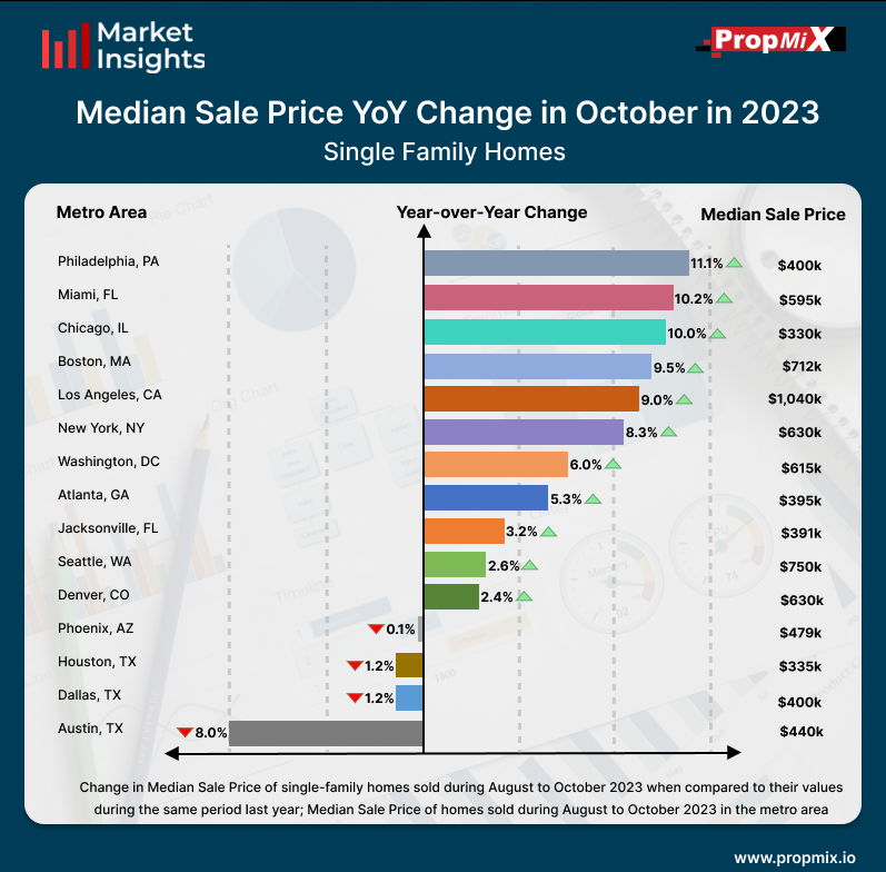 Between August and October 2023, the Chicago metro area showed a 10% increase in median home prices compared to the previous year, reaching a value of $330,000. During the same period, Austin metro area experienced the lowest year-over-year change among the top 15 metro areas, with a decrease of 8% in median sale prices compared to one year ago, with a median sale price of $440,000.