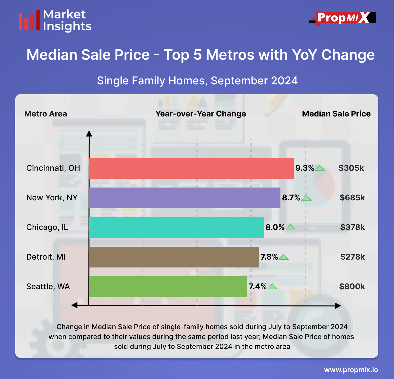 For the period from July to September 2024, among 30 metro areas in the U.S., the top five metro areas with the highest year-over-year (YoY) percentage change in median sale prices were led by the Cincinnati metro area, with a 9.3% increase and a median sale price of $305,000. Following closely was the New York metro area which saw an 8.7% rise, with its median price reaching $685,000, followed by the Chicago metro area experiencing an 8.0% YoY growth, bringing its median price to $378,000. The Detroit metro area recorded a 7.8% increase, with a median price of $278,000, while the Seattle metro area rounded out the top five with a 7.4% rise and a median sale price of $800,000.