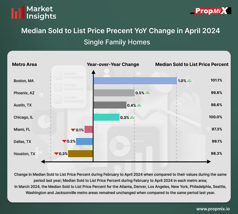 Among the top 15 metro areas, Boston experienced the highest yoy percentage change in the Median Sold to List Price Percent during February to April 2024, with a rise of 1.0% when compared to the same period last year. Conversely, Houston, saw the lowest YoY percentage change, with a decrease of 0.3%. Comparing these figures to the same period in the previous year, several metros, including Phoenix, Austin and Chicago exhibited moderate increases ranging from 0.5% to 0.3%. Other metros, such as Miami, Dallas and Houston displayed minimal decrease in Median Sold to List Price Percent. Meanwhile, metros like Atlanta, Denver, Los Angeles, New York, Philadelphia, Seattle, Washington and Jacksonville showed no YoY percentage change during February to April 2024, suggesting consistent market dynamics compared to the same period in the previous year