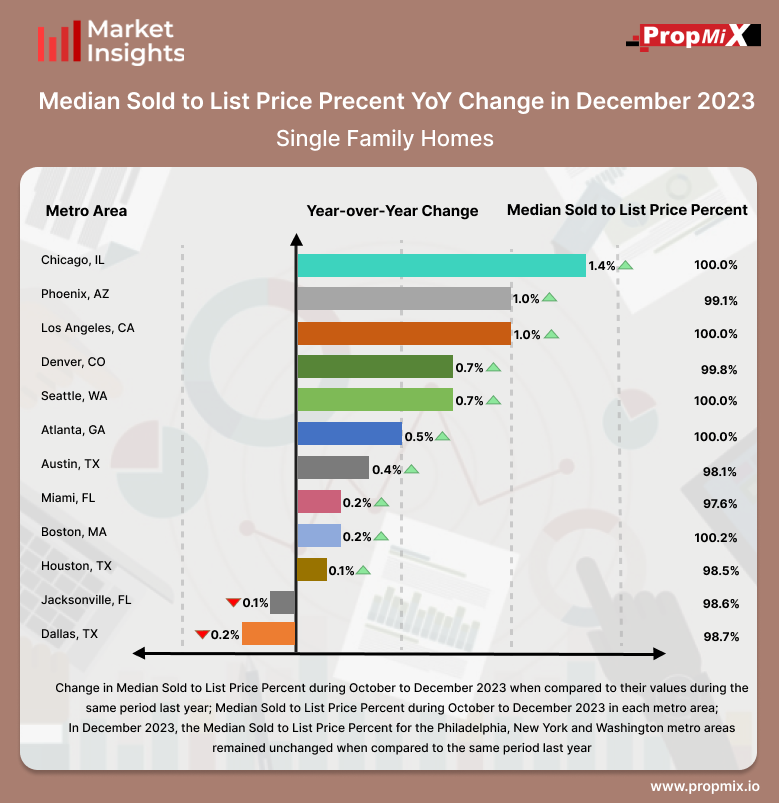 Chicago experienced the highest increase of 1.4% in the Median Sold-to-List Price Percentage among the top 15 metro areas from October to December 2023. During the same period, the Jacksonville metro area saw a decrease of 0.1%, when compared to the corresponding timeframe in the previous year.