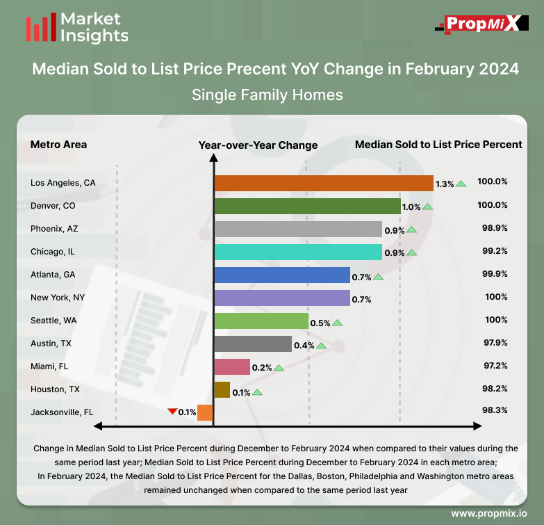 During December 2023 to February 2024, Los Angeles, CA, stood out with the highest median percentage of 100.0%, showing a significant year-over-year increase of 1.3%. In contrast, Jacksonville, FL, experienced a slight decline to 98.3%, with a small decrease of -0.1% from the previous year. Meanwhile, Denver, CO, Phoenix, AZ, and Chicago, IL, maintained robust median percentages near or above 99%, reflecting stable demand and market conditions with modest year-over-year increases of 0.9% when compared to the same period last year.
