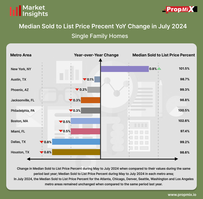 New York metro area witnessed the highest YoY percentage change in Median Sold to List Price Percent from May to July 2024, with an increase of 0.8%, reaching 101.5%. In contrast, the Houston and Dallas metro areas saw the most significant declines, each down by 0.8%, with median sale prices at 98.6% and 99.2%, respectively. Most other metro areas, including Atlanta, Chicago, Denver, Seattle, Washington, and Los Angeles, maintained a stable median of 100.0%. Meanwhile, Austin, Jacksonville, and Miami metro areas saw slight decreases ranging from 0.1% to 0.5%. For a detailed view of these trends and more insights, visit our Interactive Market Insights page.