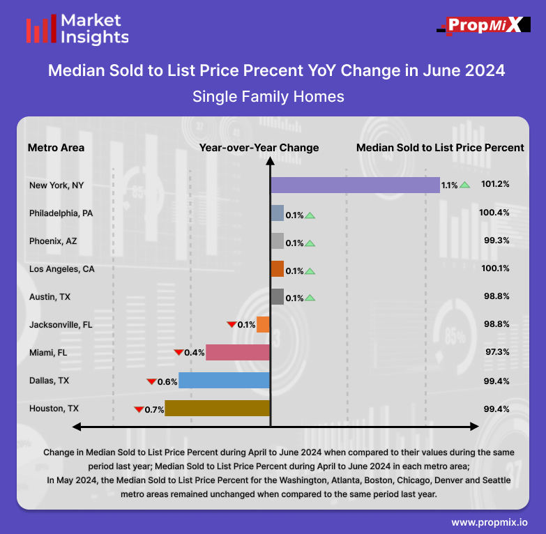 Among the top 15 metro areas, the New York metro saw the largest year-over-year (YoY) increase in Median Sold to List Price Percent for properties sold between April and June 2024, rising 1.1%. Conversely, the Houston metro area experienced the lowest YoY percentage change, with a decrease of 0.7% compared to the same period a year ago. Other metro areas, including Philadelphia, Phoenix, and Los Angeles, each showed a slight increase of 0.1% in YoY change, maintaining Median Sold to List Price Percentages near 100%. In contrast, the Jacksonville, Miami, and Dallas metro areas saw declines of 0.1%, 0.4%, and 0.6% in YoY percentage change, respectively. Metro areas such as Boston, Washington, Atlanta, Chicago, Denver, and Seattle remained stable in the YoY percentage change compared to the same period last year, with their Median Sold to List Price Percent unchanged at 100%.