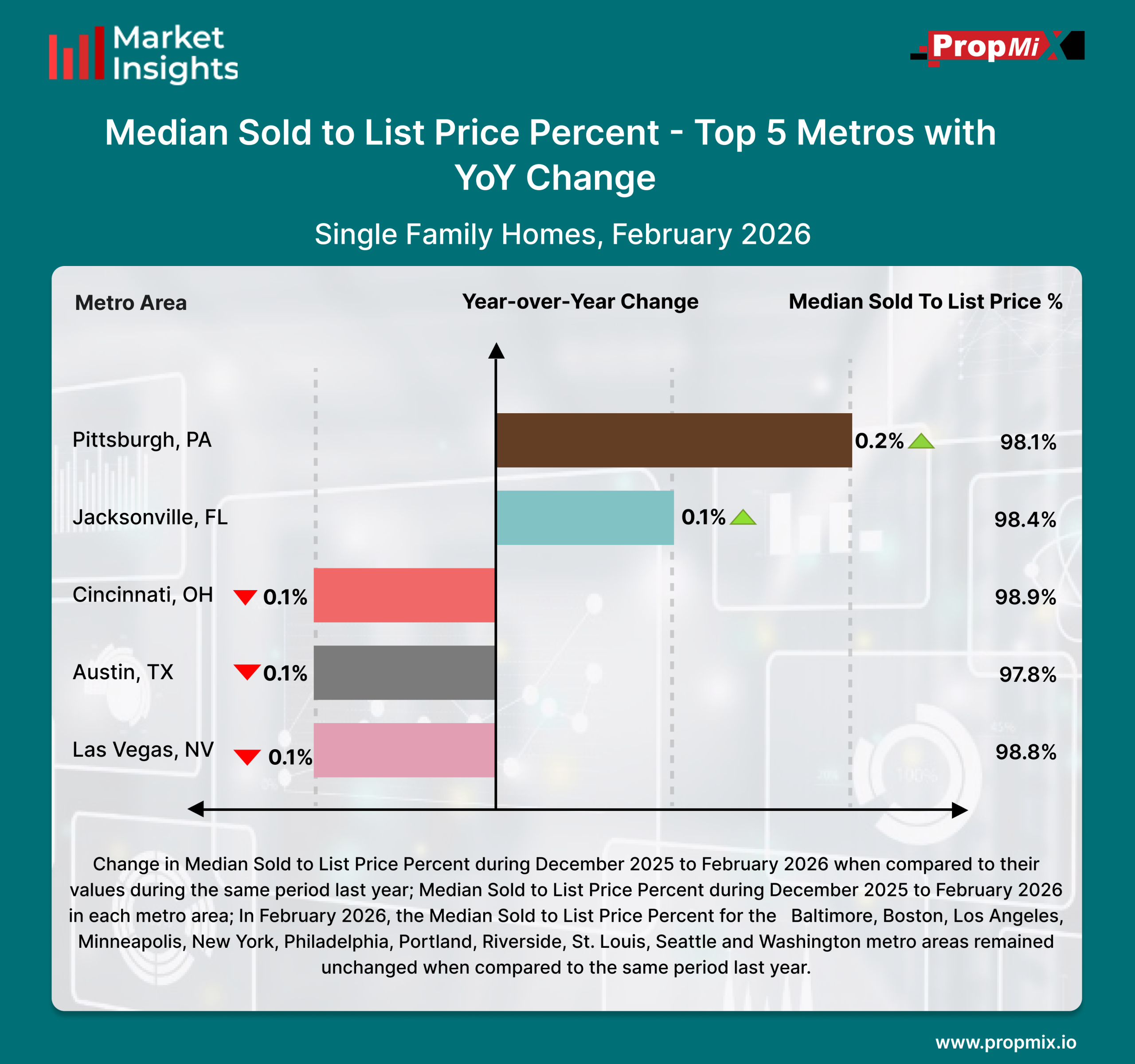 Among the top U.S. metro areas, Pittsburgh recorded the highest median sold-to-list price percentage in February 2026, with a mix of slight increases and declines observed across other metros.Pittsburgh, PA reported the highest Median Sold-to-List Price Percentage at 98.1%, reflecting a 0.2% year-over-year increase. Jacksonville, FL followed with a Median Sold-to-List Price Percentage of 98.4%, posting a 0.1% year-over-year increase. Cincinnati, OH reported 98.9%, reflecting a 0.1% year-over-year decline. Austin, TX recorded a Median Sold-to-List Price Percentage of 97.8%, down 0.1% compared to last year, while Las Vegas, NV reported 98.8%, also declining 0.1% YoY.During the December 2025 to February 2026 period, several major metro areas including Baltimore, Boston, Los Angeles, Minneapolis, New York, Philadelphia, Portland, Riverside, St. Louis, Seattle, and Washington, D.C. showed no year-over-year change, remaining consistent relative to the same period last year.