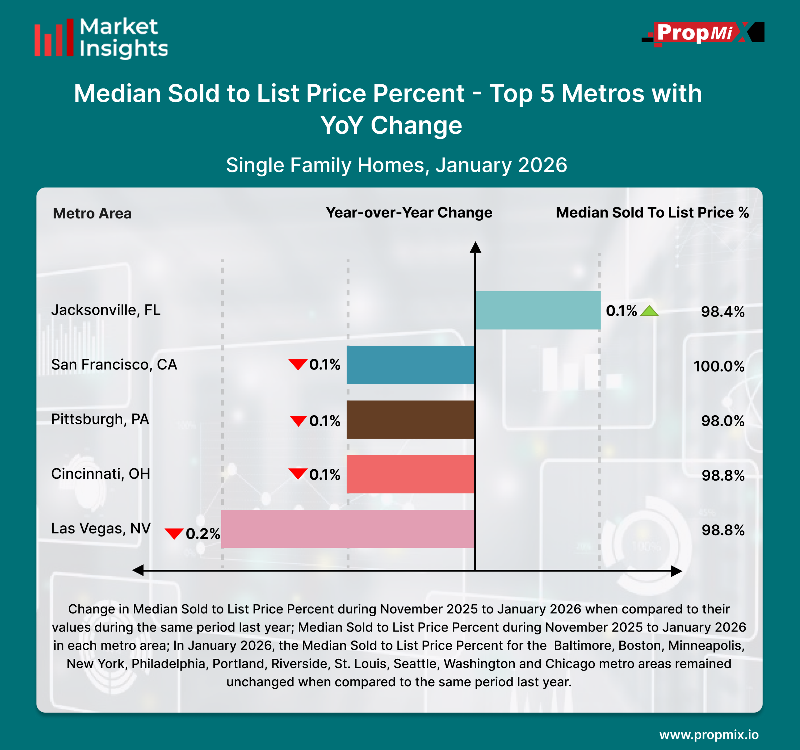 Among the top U.S. metro areas, San Francisco recorded the highest Median Sold-to-List Price Percentage in January 2026, despite a slight year-over-year decline.San Francisco, CA reported the highest Median Sold-to-List Price Percentage at 100.0%, reflecting a 0.1% year-over-year decrease. Jacksonville, FL followed with homes selling at 98.4% of the list price, marking a 0.1% year-over-year increase. Pittsburgh, PA recorded a Median Sold-to-List Price Percentage of 98.0%, down 0.1% YoY. Cincinnati, OH posted 98.8%, reflecting a 0.1% year-over-year decline, while Las Vegas, NV also stood at 98.8%, recording the largest decrease among the top metros at 0.2% YoY.During the November 2025 to January 2026 period , several major metro areas including Baltimore, Boston, Minneapolis, New York, Philadelphia, Portland, Riverside, St. Louis, Seattle, Washington, D.C., and Chicago showed no year-over-year change, remaining consistent relative to the same period last year.