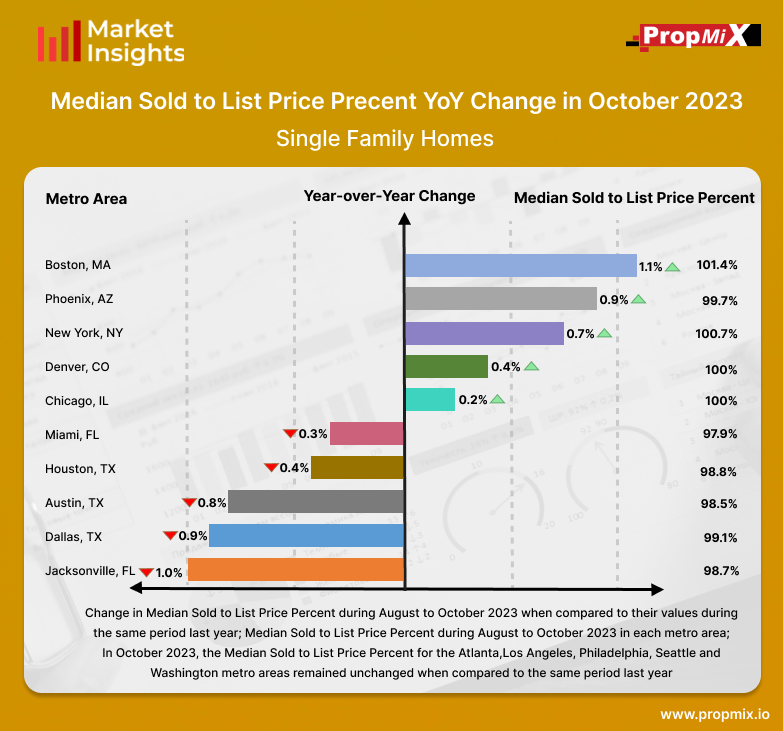 From August to October 2023, Boston experienced the highest increase, with a rise of 1.1% in the Median Sold to List Price Percentage among the top 15 metro areas. In contrast, over the same period, Dallas observed 0.9% decrease compared to the corresponding time frame in October 2022.