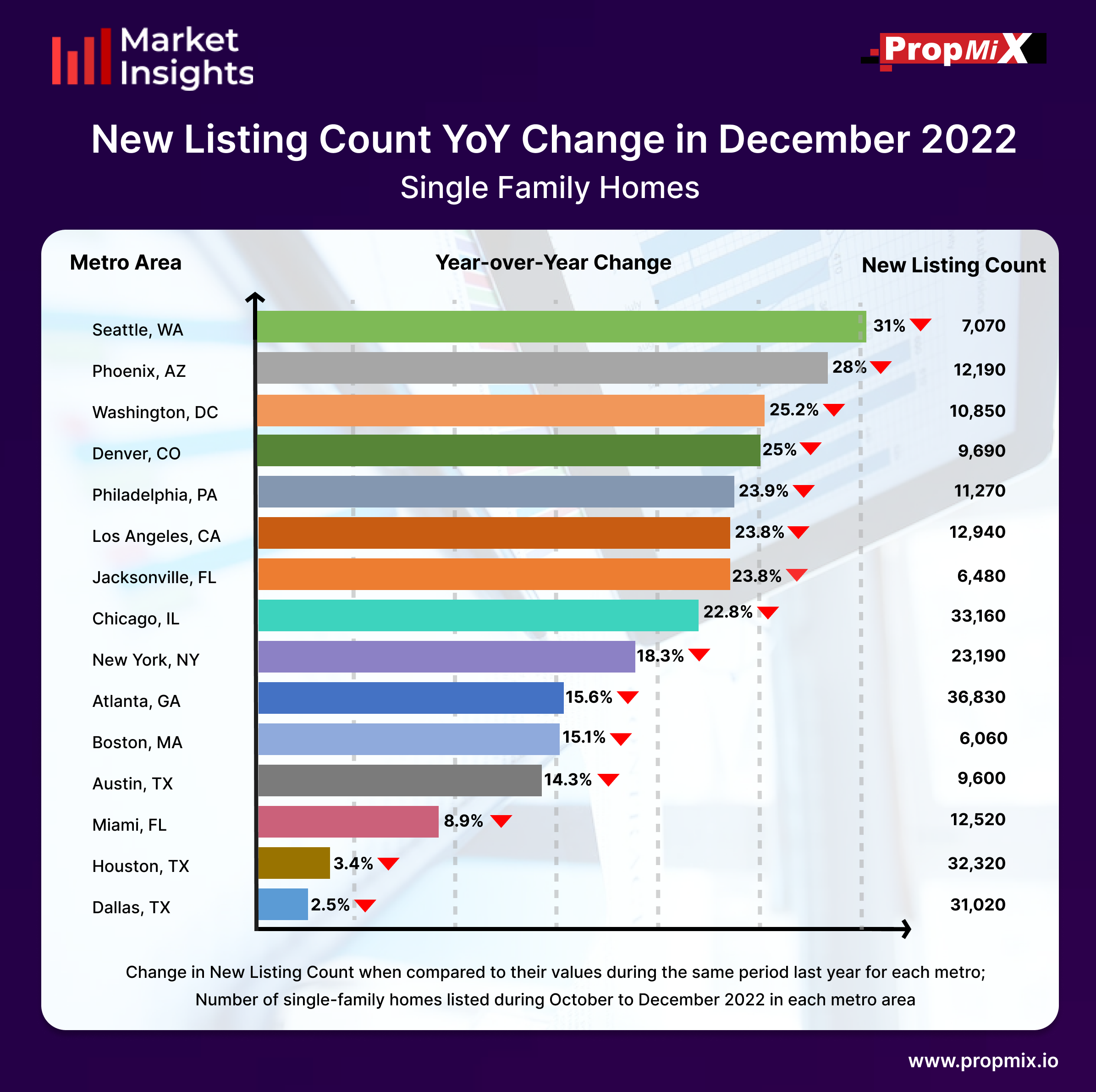 Change in New Listing Count Year-over-Year in December 2022 01/16/2023 PropMix Data Analytics Team Market Insights 0 Seattle metro area experienced the largest year-over-year decline in new listing count, down by 31% from the same time last year Atlanta metro area had the highest number of single-family homes listed between October and December 2022 having a new listing count of 36,830. Learn more about the metrics in PropMix Market Insights.
