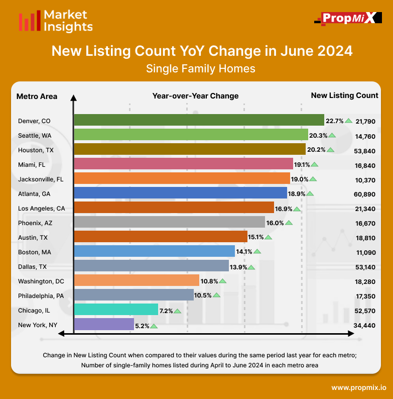From April to June 2024, among the top 15 metro areas, the Denver metro area witnessed the highest YoY change in new listings count, showing a rise of 22.7% compared to the same period last year, with a new listings count of 21,790. Meanwhile, the New York metro area saw the lowest YoY change with an increase of 5.2% and a new listings count of 34,440. Metro areas such as Seattle, Houston, and Miami experienced significant increases in the YoY change in new listings count, ranging from 20.3% to 19.1%. Jacksonville and Atlanta metro areas also saw notable rises in new listings at 19.0% and 18.9%, respectively. The Los Angeles, Phoenix, and Austin metro areas observed YoY increases of 16.9%, 16.0%, and 15.1%, respectively. Boston, Dallas, Washington, and Philadelphia metro areas had more modest increases, ranging from 14.1% to 10.5%. However, Chicago metro area saw a 7.2% increase in new listings compared to the same period in 2023.
