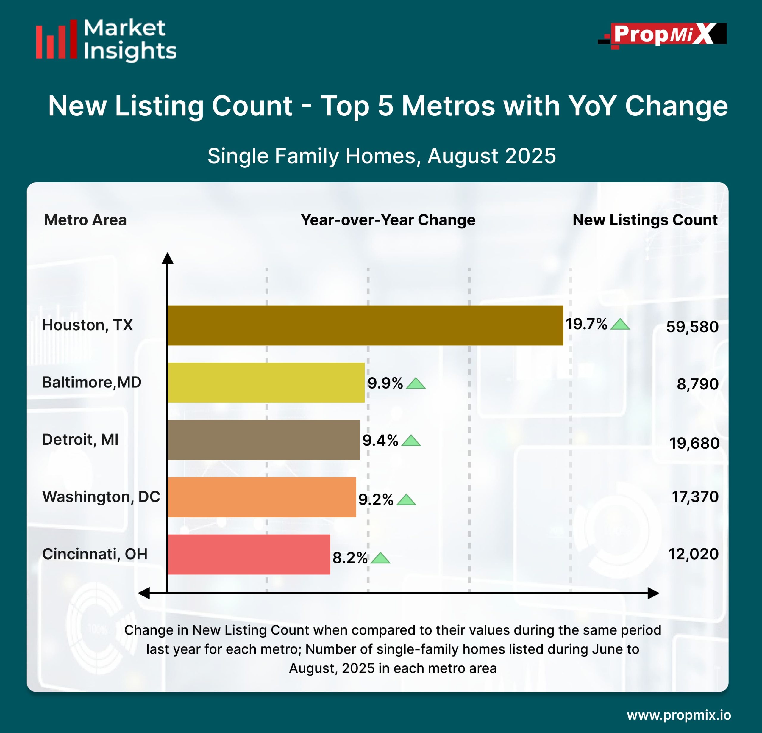In August 2025, the Houston metro area continued to dominate with 59,580 new listings, marking a 19.7% year-over-year increase—the sharpest rise among the top 30 U.S. markets. The Baltimore metro area followed with 8,790 listings, up 9.9% YoY, while the Detroit metro area closely trailed, posting 19,680 listings and a 9.4% gain. The Washington, DC metro added 17,370 properties, reflecting a 9.2% increase, and the Cincinnati metro area rounded out the leaders with 12,020 new listings, showing an 8.2% rise compared to last year.