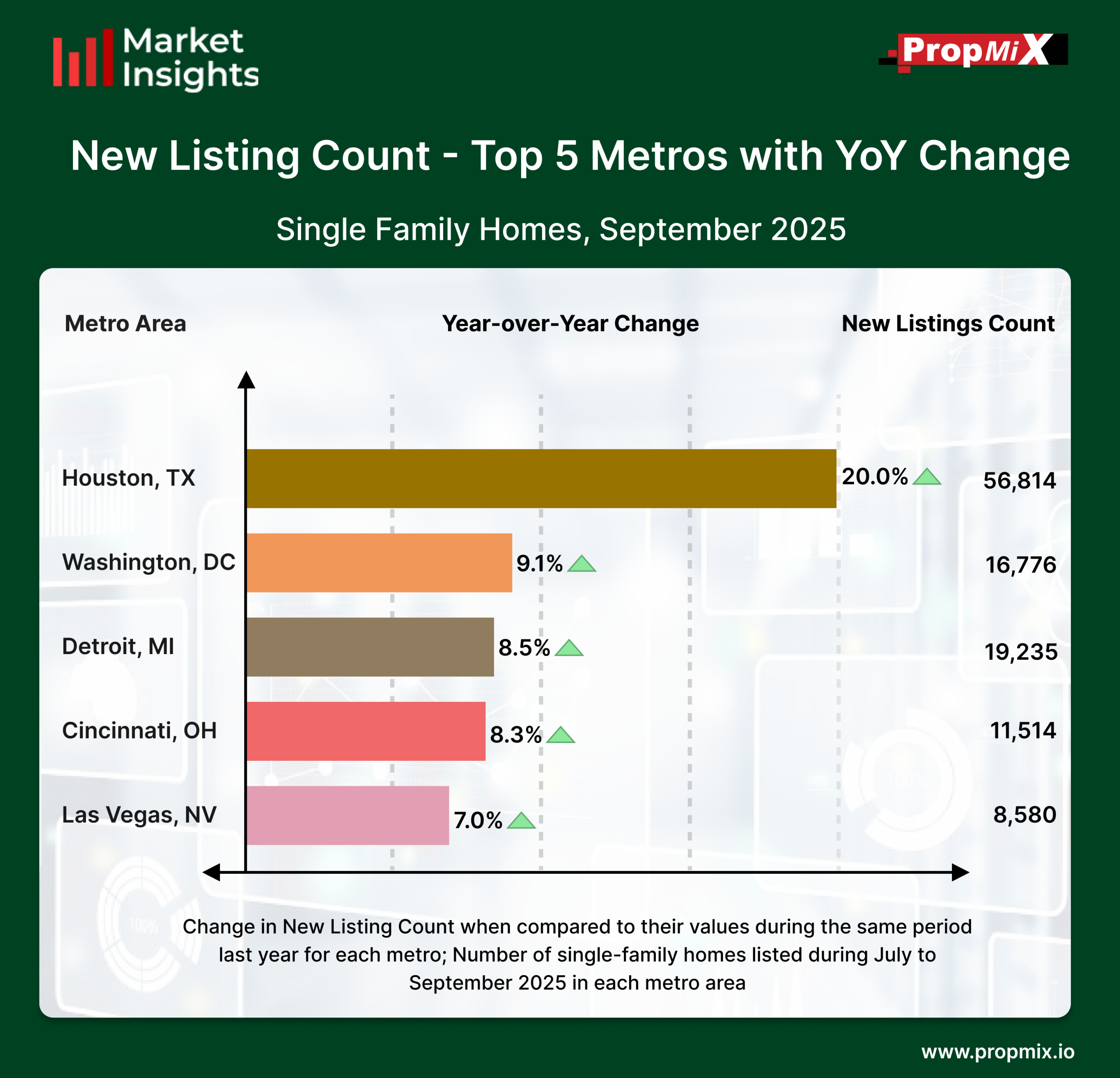The U.S. housing market maintained its momentum through September, with several metros posting solid year-over-year growth in new listings.The Houston metro once again led the nation with 56,814 new listings, reflecting a 20.0% year-over-year increase. The Washington, DC metro followed with 16,776 listings, up 9.1% YoY, while Detroit, MI posted 19,235 listings, marking an 8.5% annual rise. The Cincinnati, OH metro recorded 11,514 new listings, showing an 8.3% increase, and Las Vegas, NV rounded out the top performers with 8,580 listings, representing a 7.0% gain compared to the same period last year.