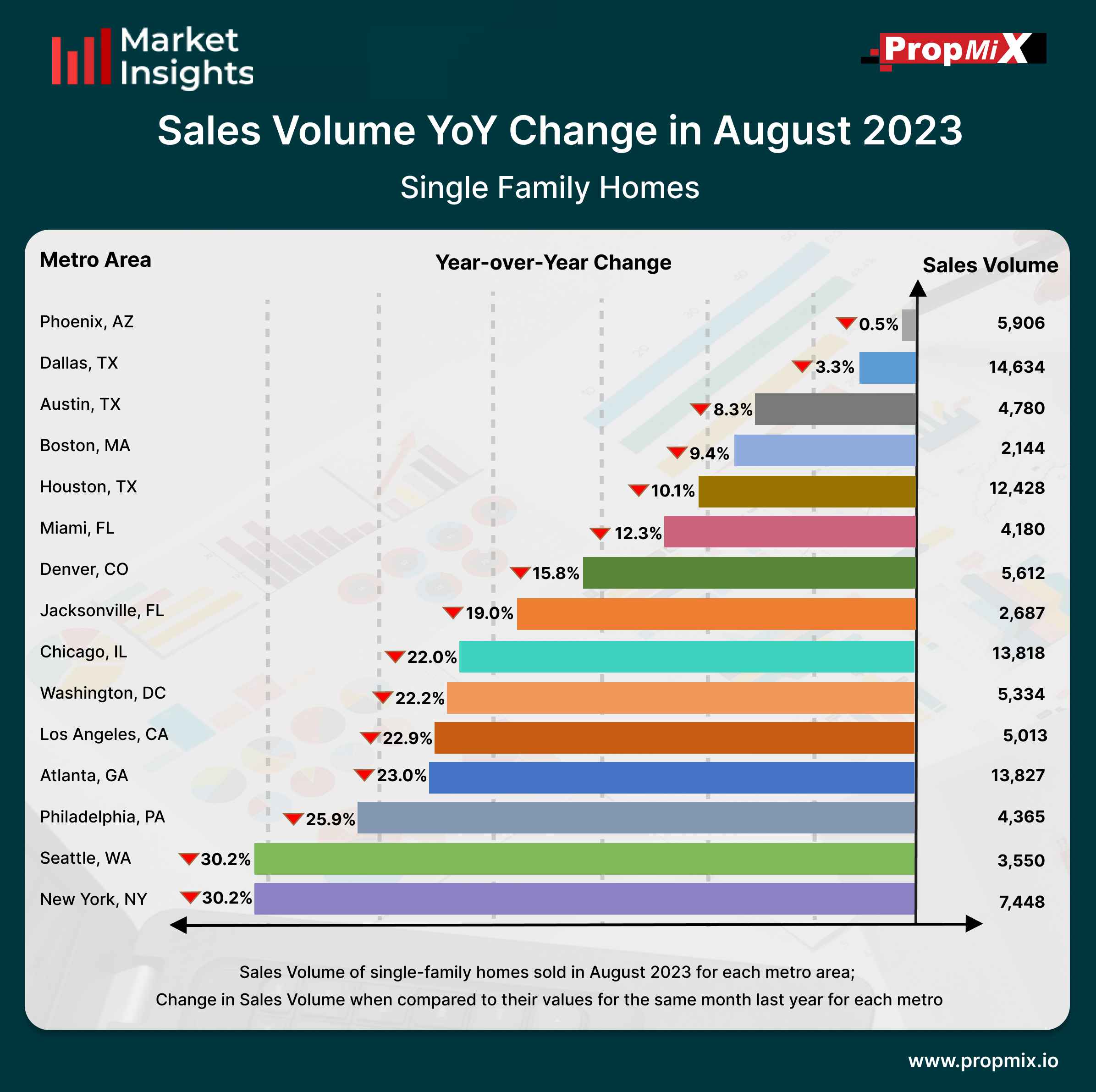 Among the top 15 metro areas, the Phoenix metro area experienced a decrease in home sales in August 2023, with 5,906 homes being sold, showing 0.5% decline when compared to August 2022. Meanwhile, the New York metro area saw the largest decrease in home sales for single-family homes, with 7,448 homes sold, marking a decrease of 30.2% compared to the same month the previous year.