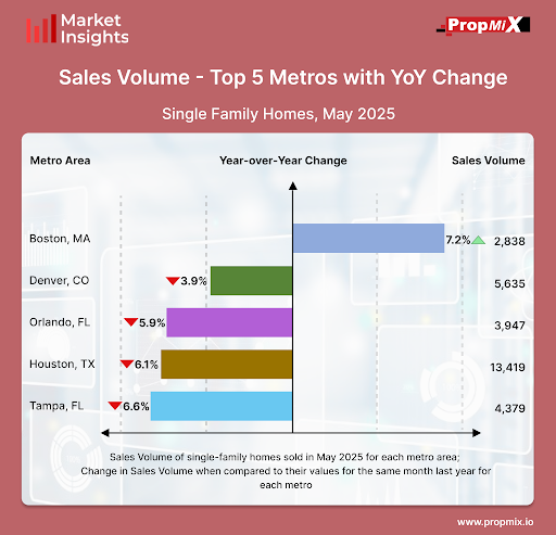 In May 2025, among the top 30 U.S. metro areas, the Boston Metro Area led with a 7.2% year-over-year increase in sales volume, recording 2,838 homes sold. In contrast, the Denver Metro Area saw a 3.9% decline, with 5,635 homes sold.The Orlando Metro Area experienced a 5.9% drop in sales volume, totaling 3,947 transactions. The Houston Metro Area followed with a 6.1% decrease, recording 13,419 homes sold. The Tampa Metro Area had the sharpest decline among the top five, with a 6.6% year-over-year drop, bringing sales down to 4,379 homes.
