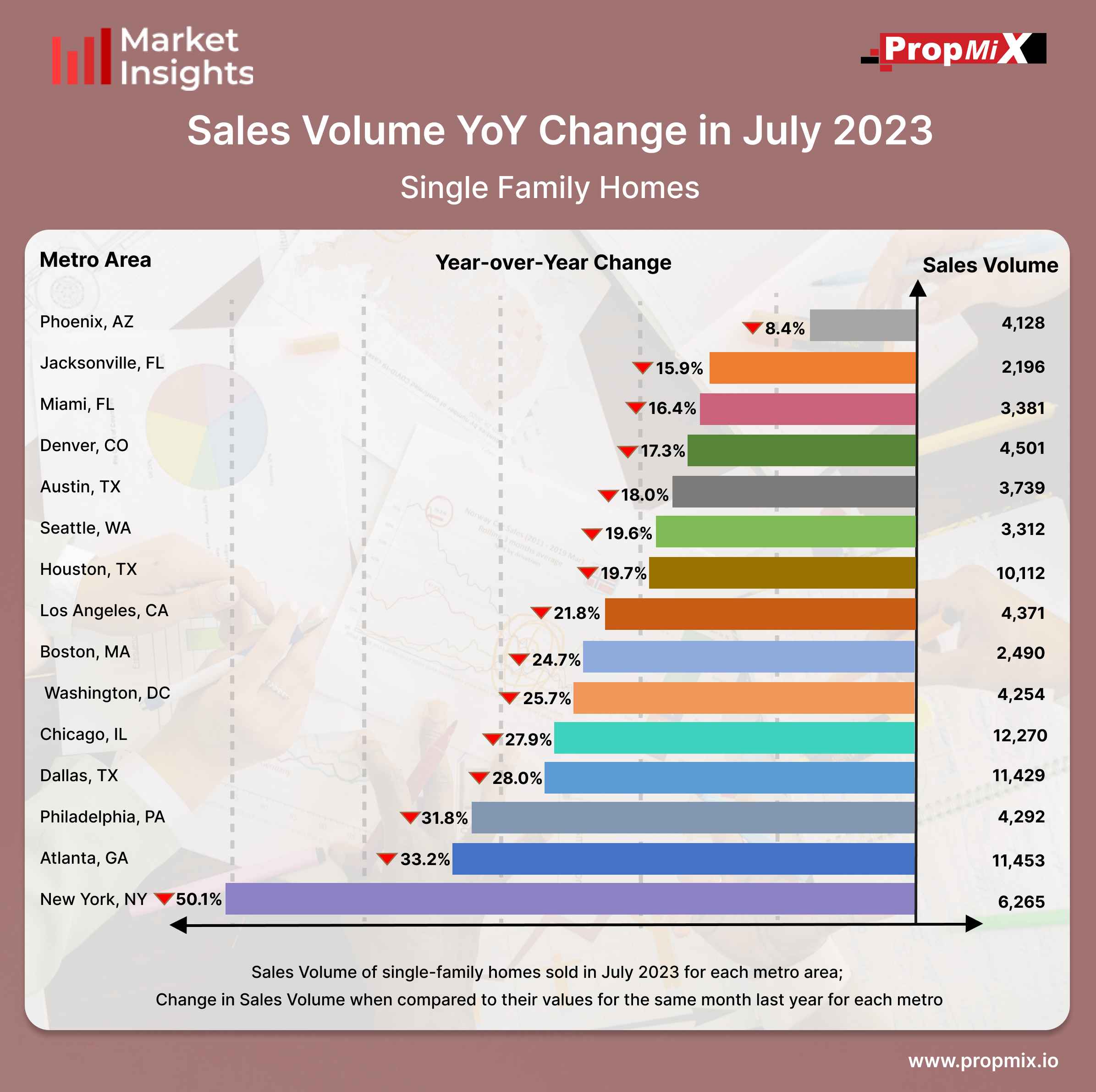 In July 2023, the Phoenix metro area witnessed a decline in sales volume, experiencing an 8.4% decrease compared to July 2022 among the top 15 metro areas, with a total of 4,128 homes sold. Meanwhile, New York metro area experienced the most notable decrease in sales volume for single-family homes in the same timeframe, with a decline of 50.1% compared to the corresponding month in the previous year.