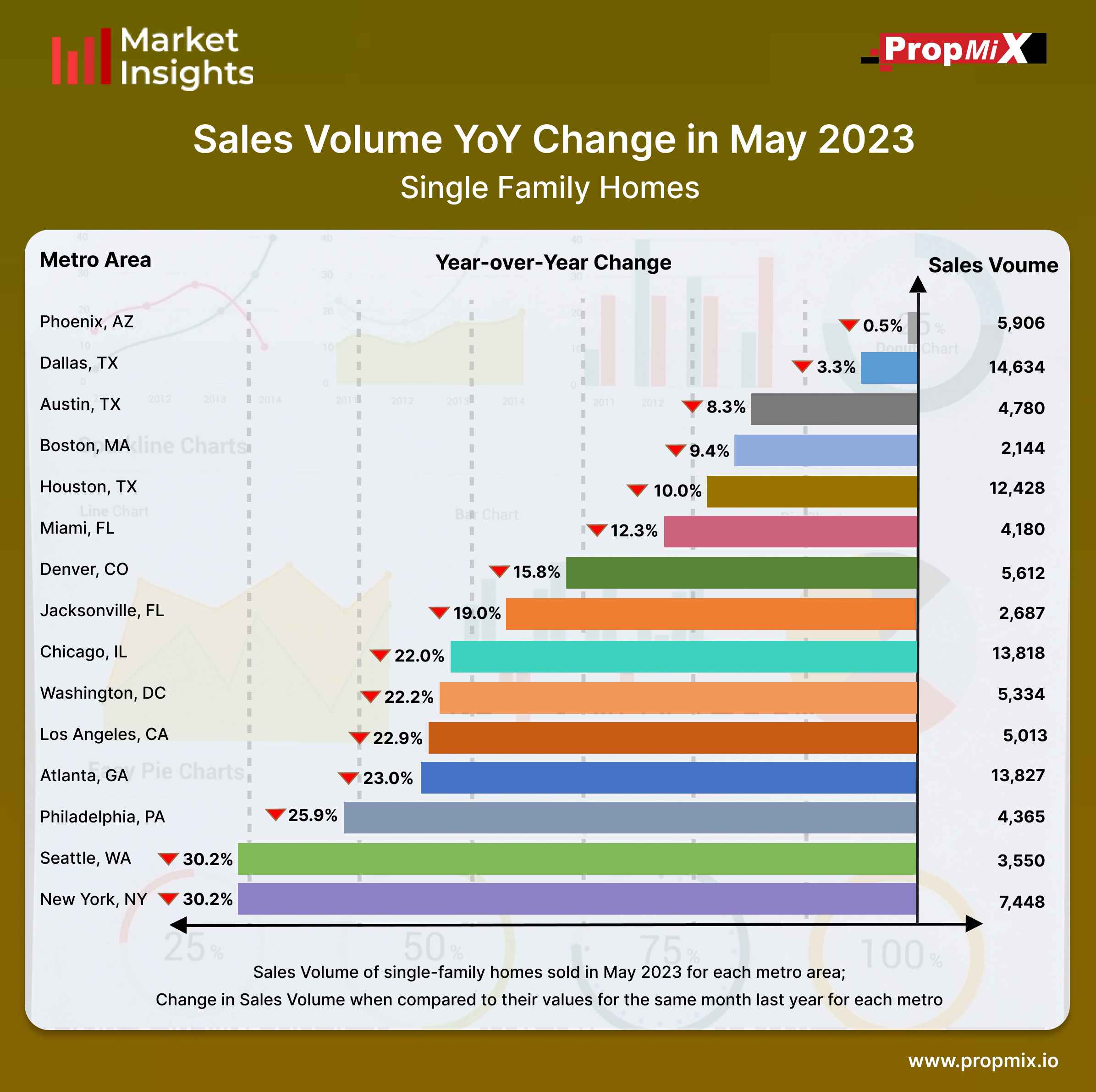 Meanwhile, New York metro area experienced the most notable decrease in sales volume for single-family homes during the same timeframe. In May 2023, the sales volume declined by 30.2% compared to the corresponding month in the previous year.This indicates a substantial decrease in real estate activity and suggests potential challenges in the New York housing market during that period.