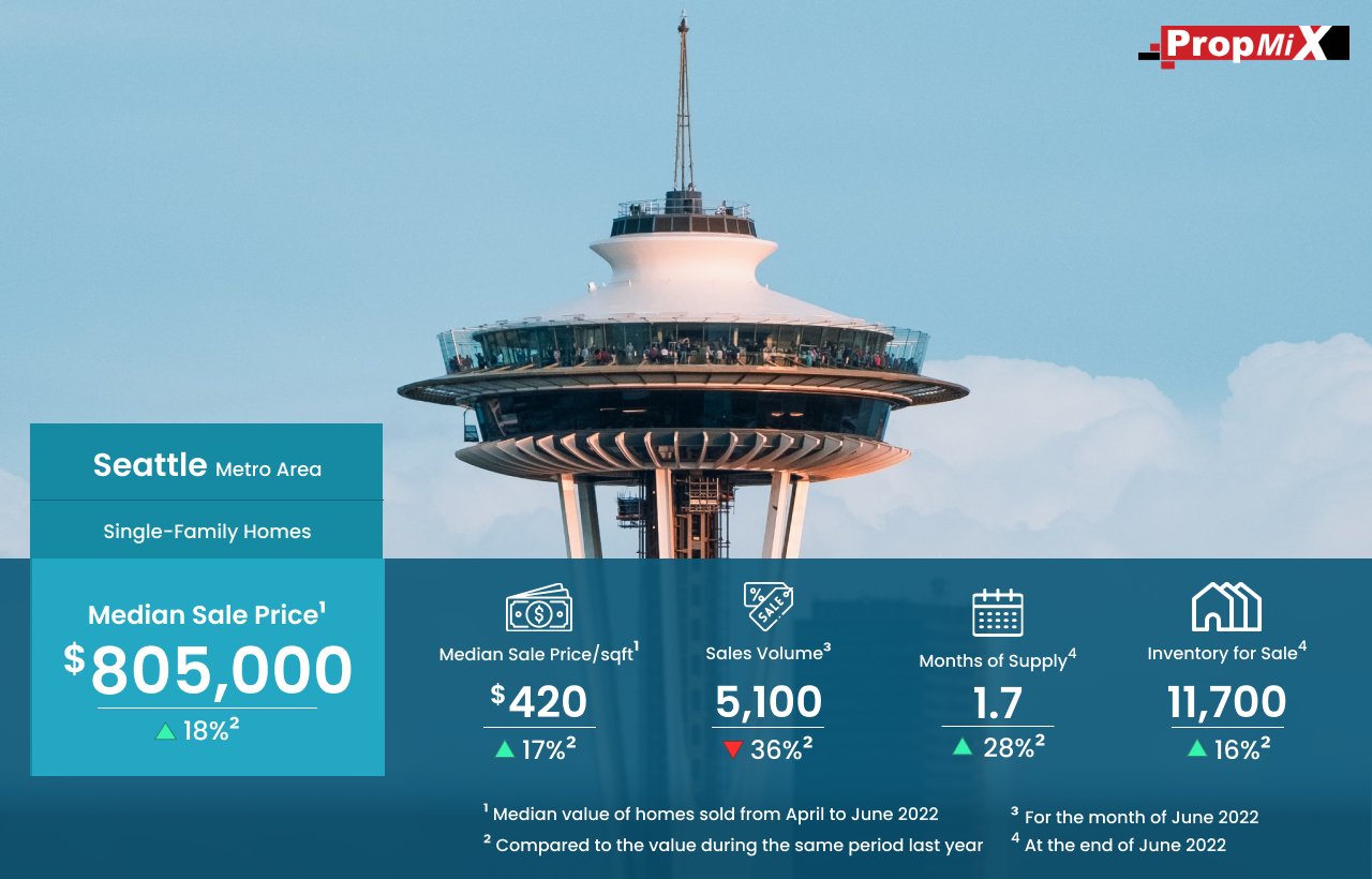 Home Sales Down by 36% in Seattle Metro Area in June 2022 08/12/2022 PropMix Data Analytics Team Market Insights 0 The number of single-family homes sold in Seattle metro area in June 2022 was 5,100, a drop of 36% over June 2021.The median sale price of homes sold was $805,000 for the period from April to June 2022, up by 18% year-over-year. Learn more about the metrics in PropMix Market Insights.