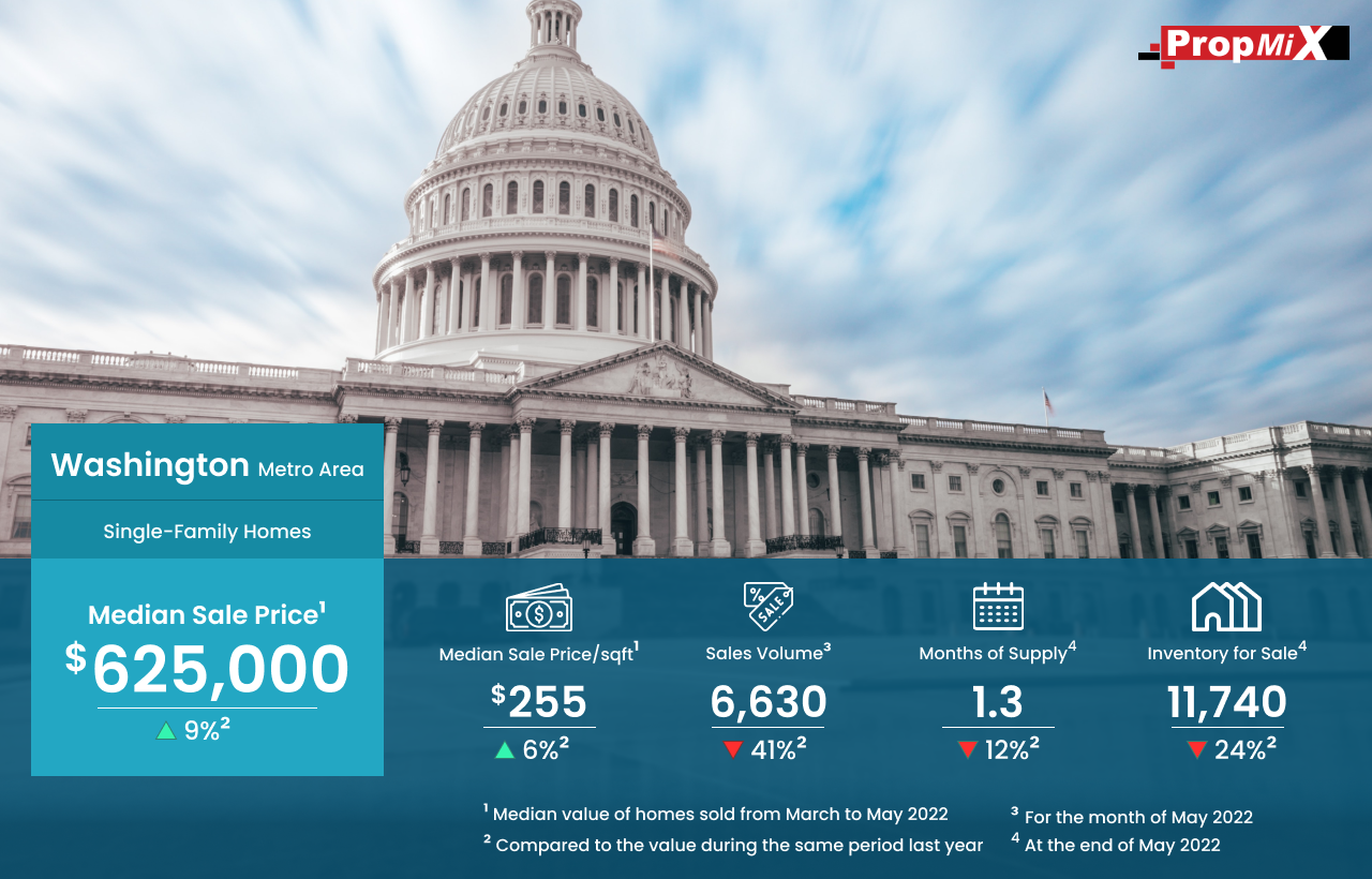 Home Sales Down by 41% in Washington Metro Area in May 2022 07/21/2022 PropMix Data Analytics Team Market Insights 0 The number of single-family homes sold in Washington metro area in May 2022 was 6,630, a drop of 41% over May 2021.The median sale price of homes sold was $625,000 for the period from March to May 2022, up by 9% year-over-year. Learn more about the metrics in PropMix Market Insights.