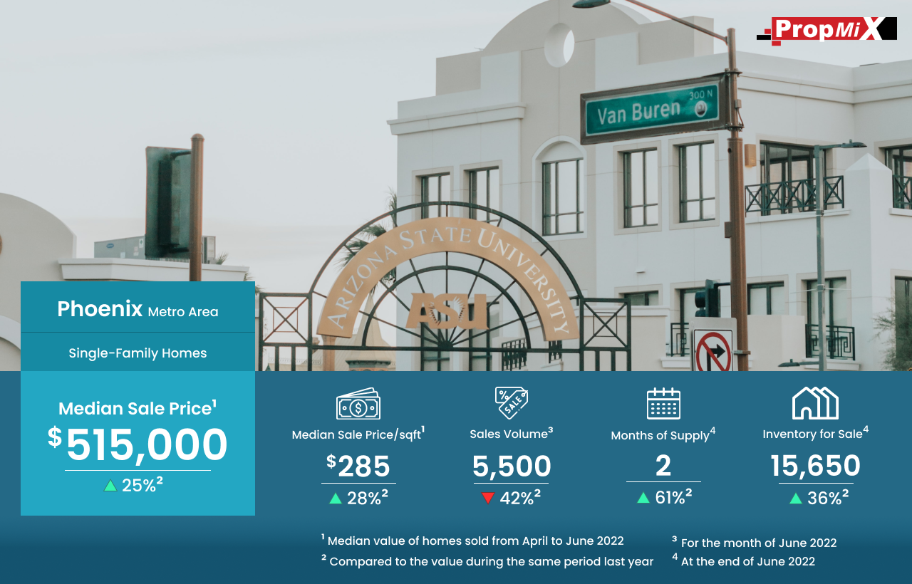 Home Sales Down by 42% in Phoenix Metro Area in June 2022 08/18/2022 PropMix Data Analytics Team Market Insights 0 The number of single-family homes sold in Phoenix metro area in June 2022 was 5,500, a drop of 42% over June 2021.The median sale price of homes sold was $515,000 for the period from April to June 2022, up by 25% year-over-year. Learn more about the metrics in PropMix Market Insights.