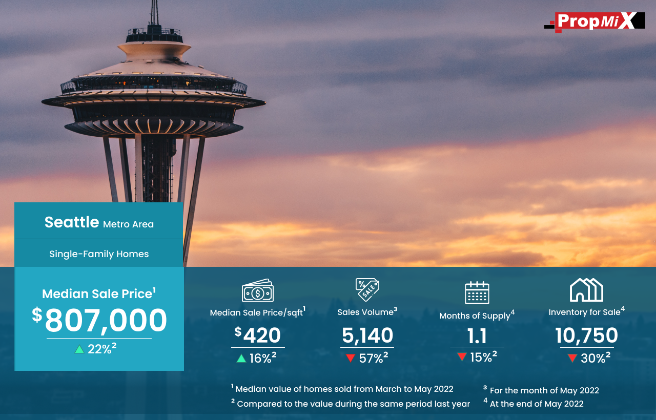 Home Sales Down by 57% in Seattle Metro Area in May 2022 07/19/2022 PropMix Data Analytics Team Market Insights 0 The number of single-family homes sold in May 2022 in the Seattle metro area was 5,140, a drop of 57% over May 2021.The median sale price of homes sold was $807,000 for the period from March to May 2022, up by 22% year-over-year. Learn more about the metrics in PropMix Market Insights.