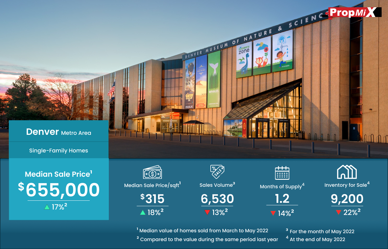 Inventory For Sale Down by 22% in Denver Metro Area in May 2022 07/15/2022 PropMix Data Analytics Team Market Insights 0 The inventory for sale by the end of May 2022 in the Denver metro area was 9,200, a drop of 22% over May 2021. The median sale price of homes sold was $655,000 for the period from March to May 2022, up by 17% year-over-year. Learn more about the metrics in PropMix Market Insights.