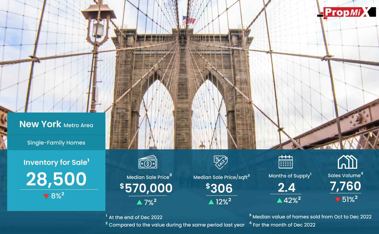Inventory For Sale Down by 8% in New York Metro Area in December 2022 01/24/2023 PropMix Data Analytics Team Market Insights 0 The inventory for sale by the end of December 2022 in the New York metro area was 28,500, dip by 8% over December 2021. Learn more about the metrics in PropMix Market Insights.