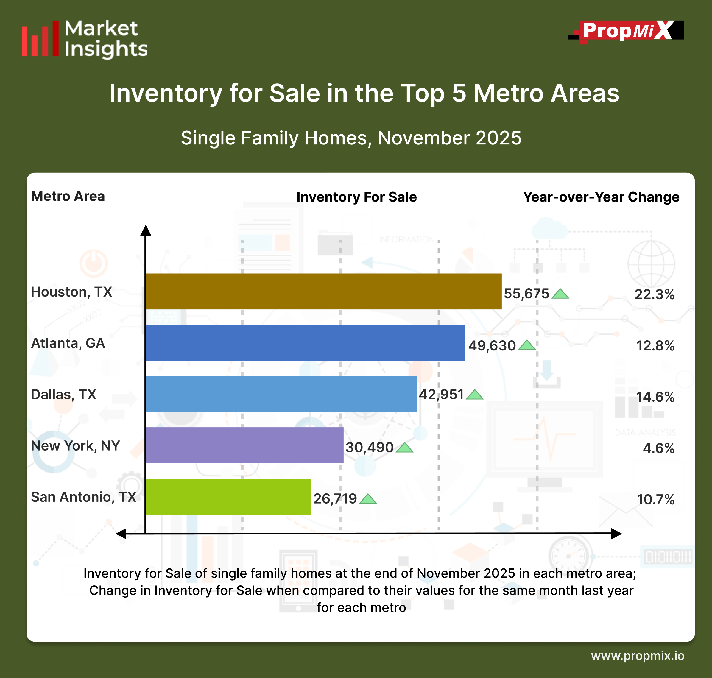 November 2025 inventory figures show year-over-year increases in active listings across several major U.S. metro areas. The Houston metro area remained the largest market by available inventory, with 55,675 homes for sale, reflecting a 22.3% year-over-year increase. Atlanta followed with 49,630 active listings, up 12.8% YoY. The Dallas metro area recorded 42,951 homes on the market, marking a 14.6% annual increase.The New York City metro area reported 30,490 homes for sale, showing a 4.6% YoY gain, while San Antonio rounded out the top five with 26,719 active listings, up 10.7% year over year. Overall, November 2025 inventory data reflects continued year-over-year increases in active listings across several major U.S. metro areas.