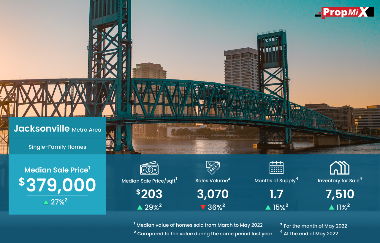 The median sale price of single-family homes sold in the Jacksonville metro area was $379,000 for the period from March to May 2022, up by 27% year-over-year.