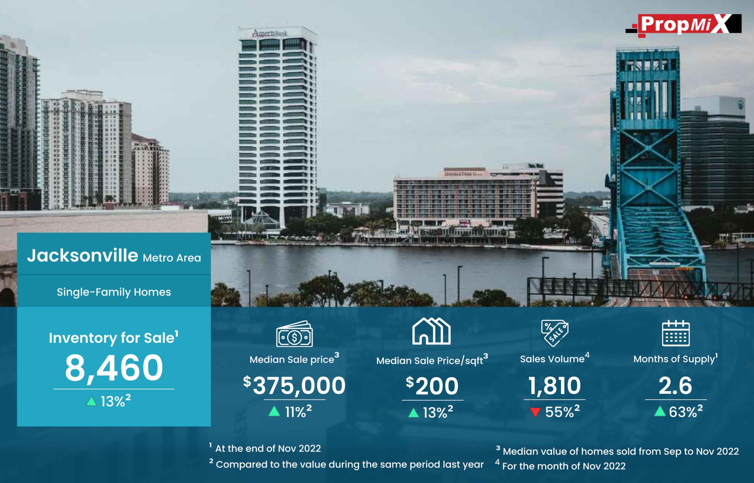 Inventory For Sale Up by 13% in Jacksonville Metro Area in November 2022 12/11/2022 PropMix Data Analytics Team Market Insights 0 The inventory for sale by the end of November 2022 in the Jacksonville metro area was 8,460, up by 13% over November 2021. Learn more about the metrics in PropMix Market Insights.