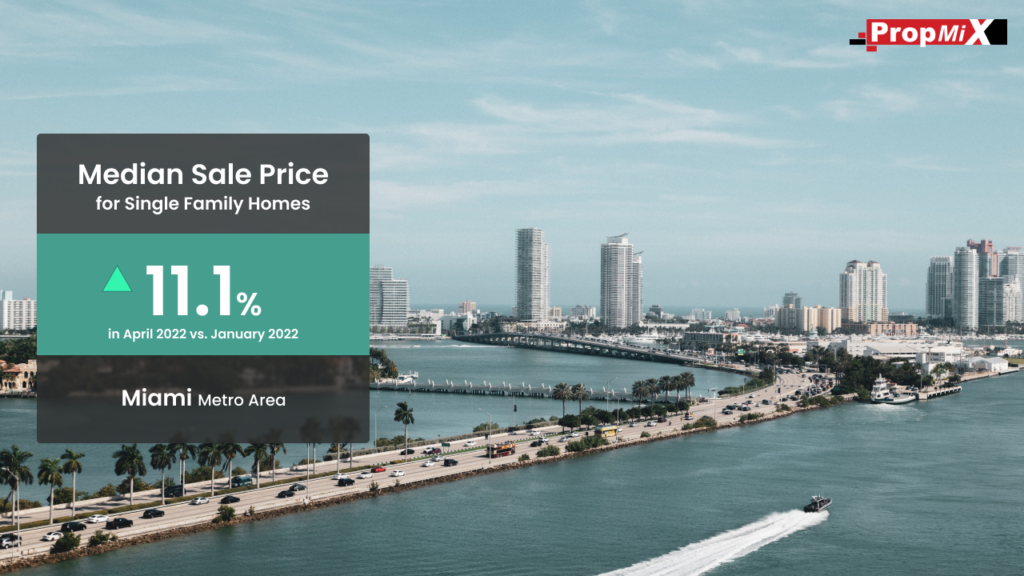 The median sales price for a single-family home in Miami metro area from Feb to Apr 2022 was $530,000, an increase of 22% compared to the same period in 2021. The latest figures also indicated an increase in median sale price of 11.1% compared to the Nov 2021 to Jan 2022 period.