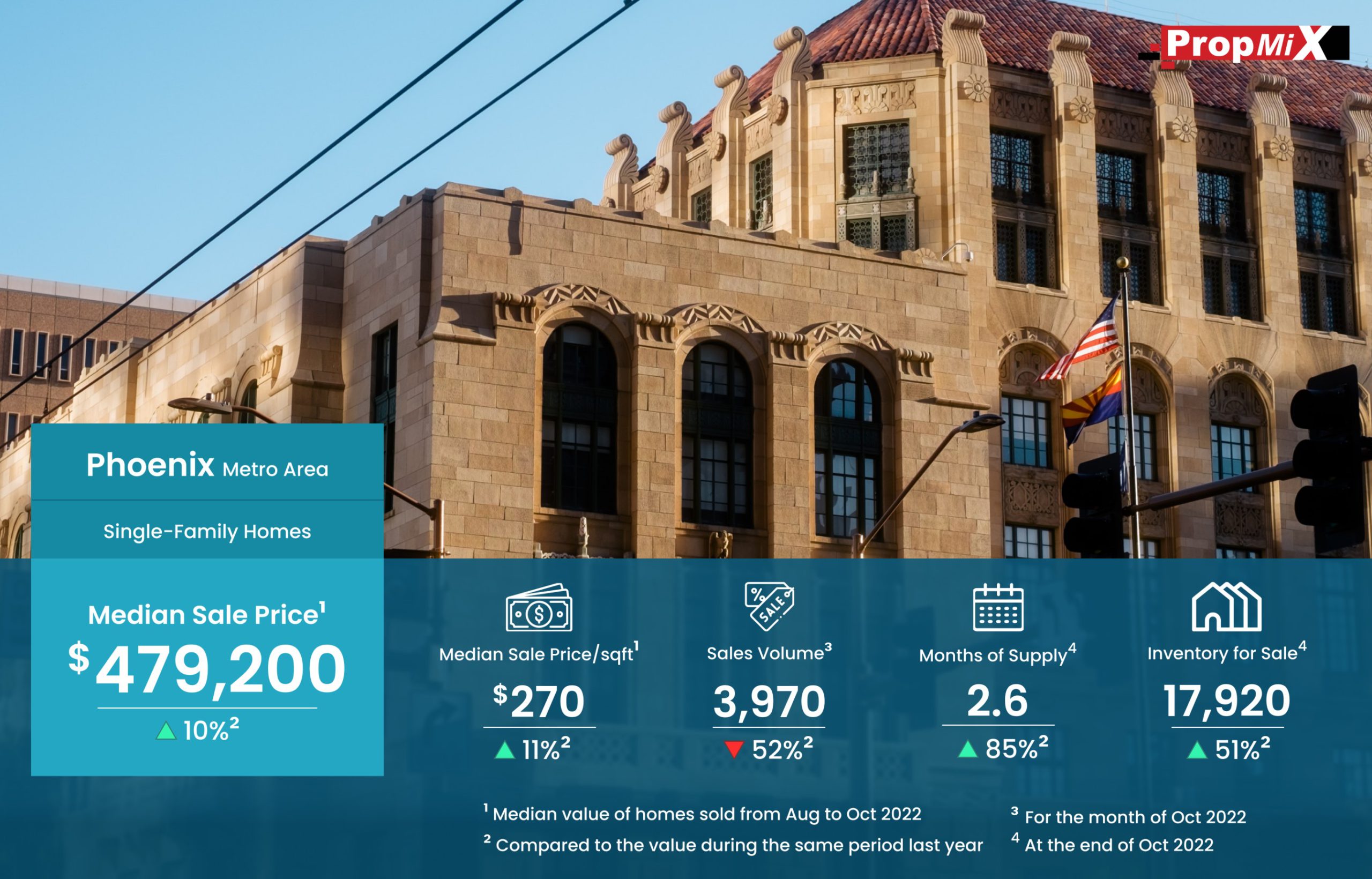 Median Sale Price Up by 10% in Phoenix Metro Area in October 2022 11/07/2022 PropMix Data Analytics Team Market Insights 0 The median sale price of single-family homes sold in the Phoenix metro area was $479,200 for the period from August to October 2022, up by 10% year-over. Learn more about the metrics in PropMix Market Insights.