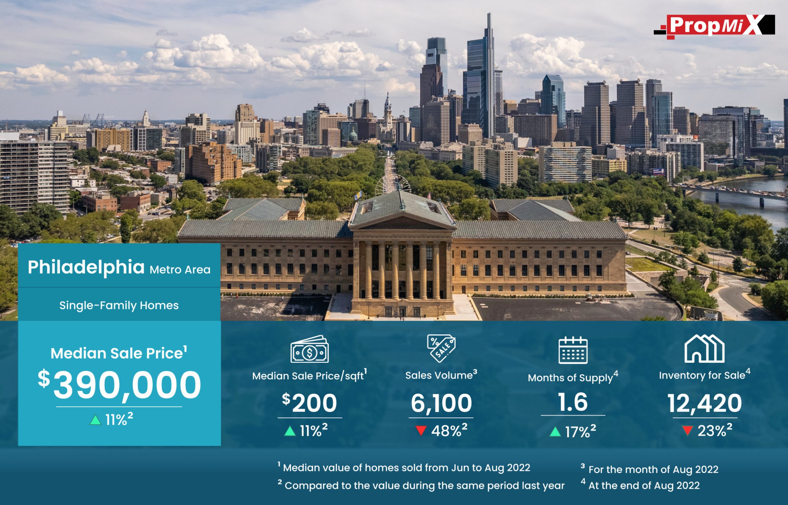 Median Sale Price Up by 11% in Philadelphia Metro Area in August 2022 09/18/2022 PropMix Data Analytics Team Market Insights 0 The median sale price of single-family homes sold in the Philadelphia metro area was $390,000 for the period from June to August 2022, up by 11% year-over-year. Learn more about the metrics in PropMix Market Insights.