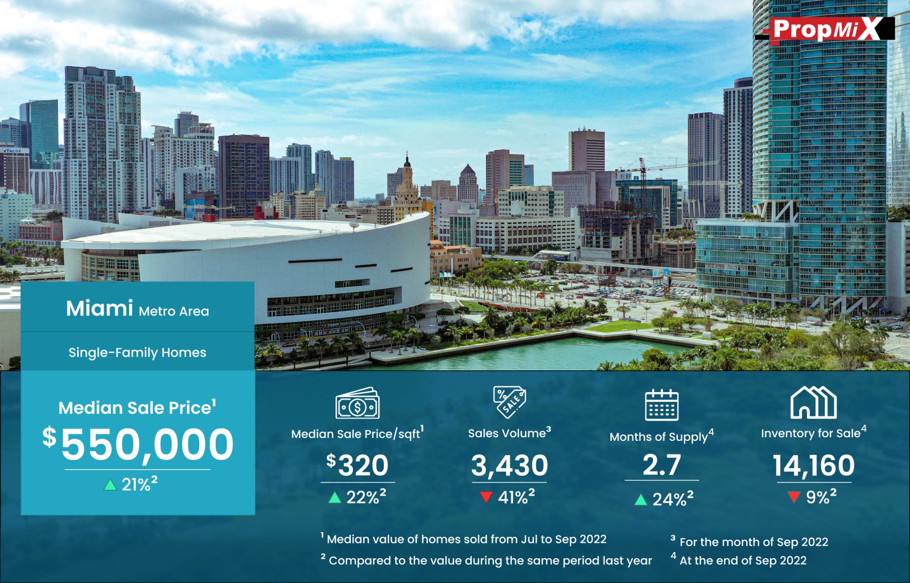 The median sale price of single-family homes sold in the Miami metro area was $550,000 for the period from July to September 2022, up by 21% year-over-year.