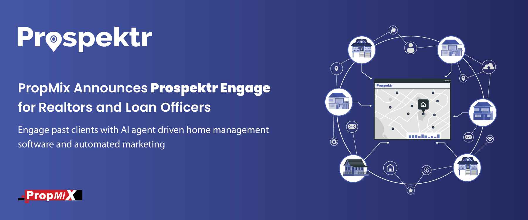 Prospektr.ai is powered by the PropMix AI platform which includes mortgage insights, property valuations, rental values, cap rates, mortgage options, and more for every residence. Prospektr Engage is a new edition which carves out the core features that drive homeowner engagement so that it can be independently used by realtors and loan officers.