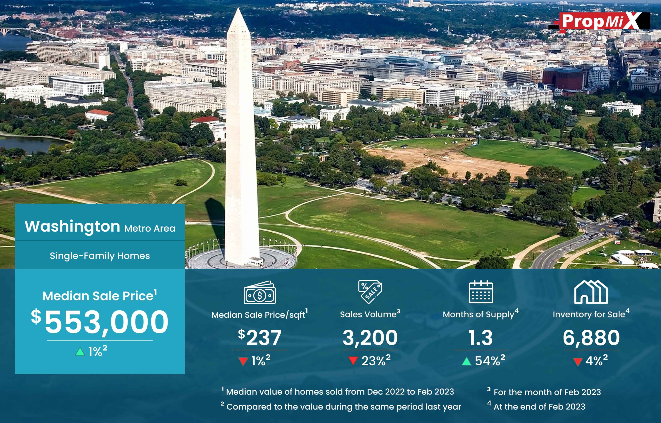 Washington Metro Area Rose by 1% in Median Sale Price During February 2023 03/29/2023 PropMix Data Analytics Team Market Insights 0 The median sale price in the Washington metro region rose by 1% year over year between December 2022 and February 2023, reaching $553,000 in value. Meanwhile, the number of single family homes sold in February 2023 was 3,200, a decline of 23% from the same month last year. Learn more about the metrics in PropMix Market Insights.